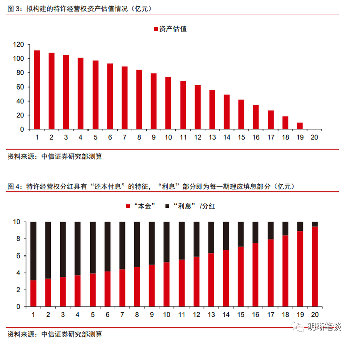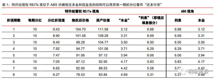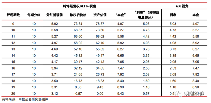 尽管市场投资者对于特许经营权REITs发生填息的预期较弱,但理论上其存在填息效应,并能够满足投资者在当期获得与IRR相同水平的收益率。基于存量特许经营权REITs的经验,我们构建一个剩余期限20年、按年度频率每年分红10亿元、全周期IRR为6%的特许经营权资产。以未来现金流折现求和模型对其进行估值,并对每年的分红金额进行拆解,得到如下结论:(1)虽然特许经营权REITs的本质是股权资产,但其到期价值归零,类似于ABS分摊偿还本金和现金流的结构使得我们可以将其每一期的分红看作“还本付息”,并可进一步拆解为“本金”和“利息”两部分;(2)特许经营权REITs在理论上同样存在一定程度的填息效应,每一期理应填息部分即为当期的资产评估价值与除息价格后的差额,即“本金”中的“利息”部分;(3)若实际发生的填息效应达到理论值,则投资者在当期可获得与IRR相同水平的收益率。