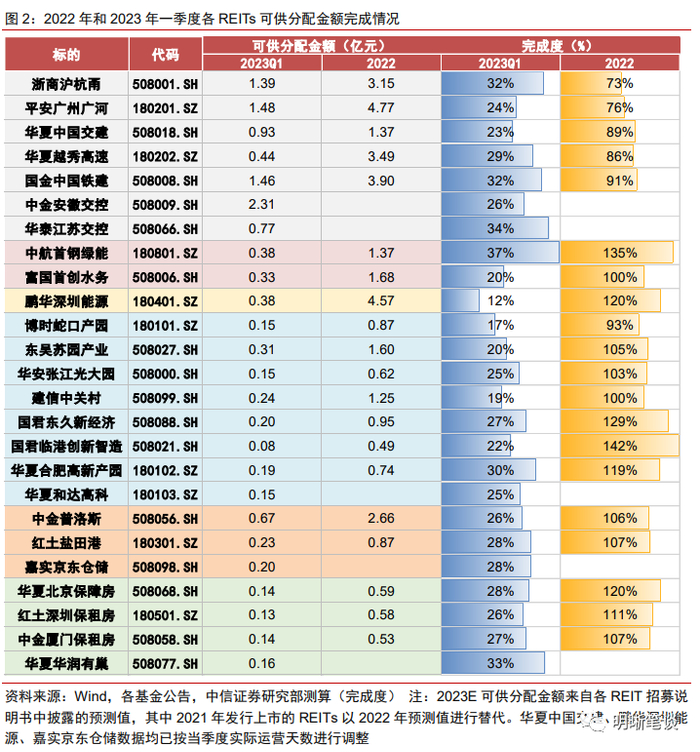 REITs可供分配金额与底层资产经营情况挂钩,受到宏观经济周期等多方面因素扰动,因此实际分红仍面临一定波动。公式上,公募REITs可供分配金额从净利润出发,通过调整折旧摊销、利息支出、所得税费用、资本性支出等计算得出,因此底层基础设施的运营情况对于当年公募REITs完成的可供分配金额具有较大影响。以2022年和2023年一季度的数据为例:(1)2022年,除高速公路的可供分配金额不及预期外,其余大部分REITs的可供分配金额均实现了招募说明书的预测值。其中,局部疫情扰动频发对于其收入端的冲击明显,叠加通行费减免政策,使得高速公路REITs底层资产2022年的业绩不及预期,进而导致全年可供分配金额仅完成预测值的70%-90%;(2)2023年一季度,因重要现金流提供方租户到期不续约、提前退租等因素导致部分产业园区REITs的出租率显著下滑,收入端的表现不及预期也导致可供分配金额完成度整体偏低。因此,由于REITs可供分配金额与底层资产经营情况挂钩,受到宏观经济周期等多方面因素扰动,公募REITs的实际分红仍存在波动。