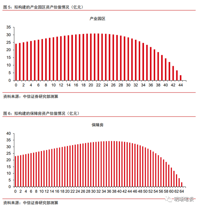 由于产权期限更长,产权REITs的底层资产估值在前期能够保持稳定增长,其填息效应往往也更为明显。与前文的特许经营权分析框架类似,我们基于存量产业园区和保障房等产权REITs的经验,构建两个资产:一是剩余期限45年、按年度频率每年分红1亿元、租金增长率为3%、折现率为6%的产业园区资产;二是剩余期限65年、按年度频率每年分红1亿元、租金增长率为2%、折现率为6%的保障房资产。以未来现金流折现求和模型对其进行估值,得到如下结论:(1)产权资产的估值与租金增长率、产品期限等参数有关,整体或呈现先增后减的趋势,增长率越高估值增长也越明显;(2)由于产权期限显著长于特许经营权期限,同时到期或可延长,因此产权REITs的分红与填息更类似股票资产,投资者的理解更加清晰,也导致了产权REITs的填权效应较为明显。