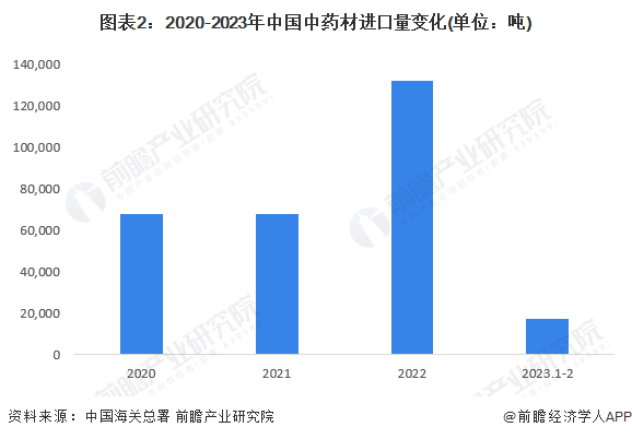 我国是全球最大的药材消费市场,但存在部分地区存在中药材品种产能不足甚至没有资源分布的问题,因此对中药材有一定的进口需求。2020-2021年,中国中药材进口量较为稳定,维持在6.7-6.9万吨左右;2022年中国中药材进口量大幅增长,达13万吨,约为往年水平的两倍。截至2023年2月末,中国中药材进口量为1.7万吨。