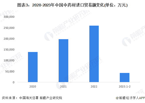 从进口额,2020-2022年,与中国中药材进口量变化情况不同的是中国中药材进口额逐年增长。2022年,中药材进口额达到25.9亿元;2023年1-2月,中药材进口额达4.2亿元。