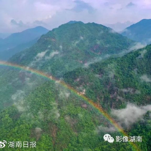 5月19日下午,莽山国家级自然保护区,山峦之中云雾弥漫,雨后彩虹与奇峰、怪石、古松等相互辉映,如诗如画。