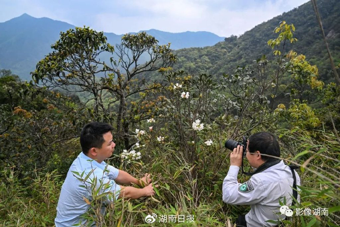 5月19日,莽山国家级自然保护区,“花博士”邓国杏(右)带领工作人员在采集杜鹃花样本。