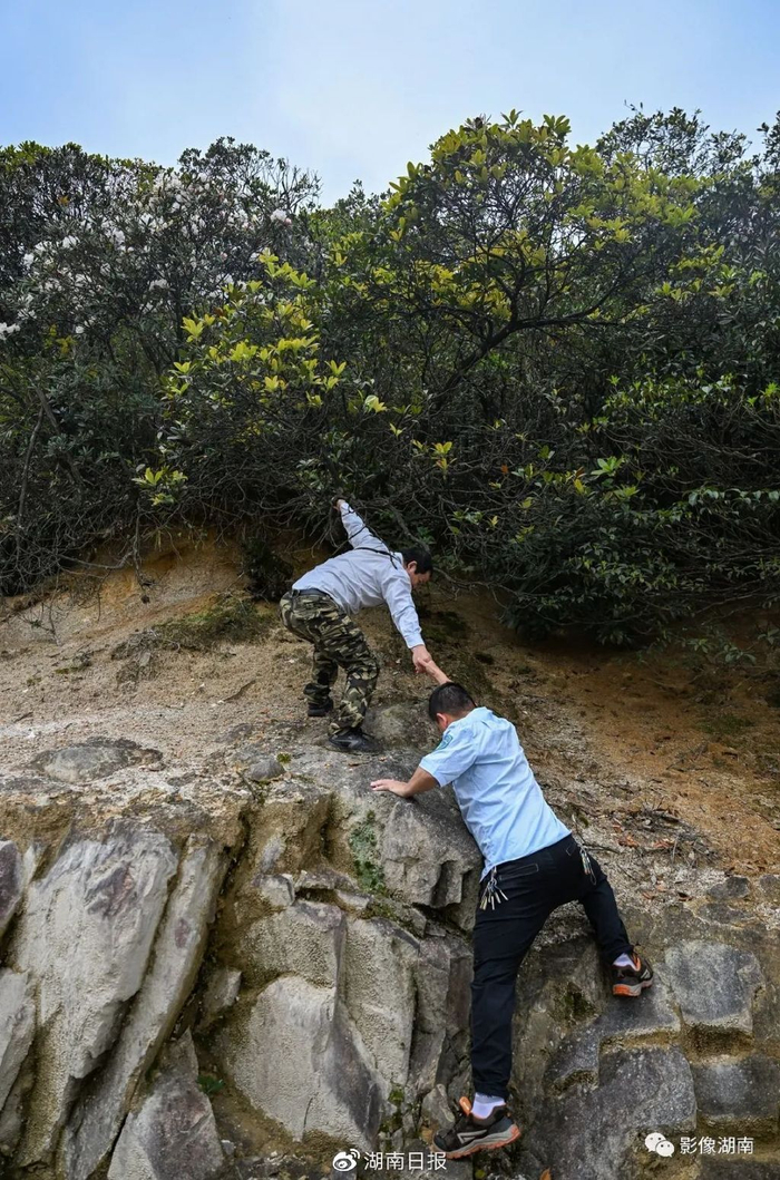 5月19日,莽山国家级自然保护区,“花博士”邓国杏(上)和工作人员爬上陡峭的岩石采集野生植物样本。