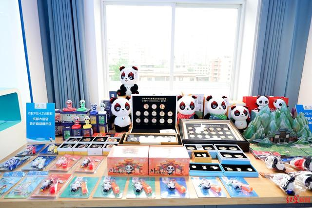 5月21日,距大运会开幕还有倒计时68天,第31届世界大学生夏季运动会特许经营创新峰会分论坛特许经营生态产业链发展论坛在成都市宽窄巷子景区举行。论坛现场,数百只可爱的蓉宝玩偶、纪念章等大运会特许新品摆满展厅,引参会嘉宾纷纷拍照。多位成都大运会执委会相关工作人员、特许企业代表出席本次活动。