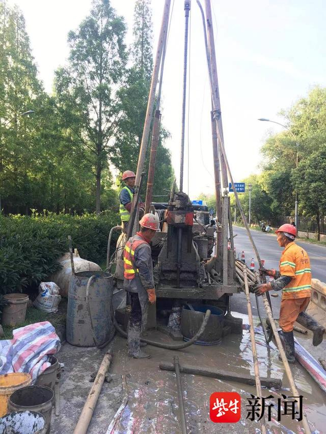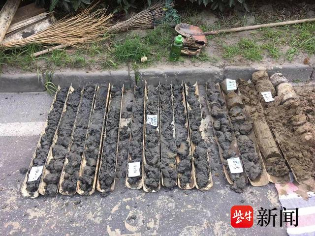 记者看到,道路东半幅快车道,塑料水马围起了一股车道,三名工人在钻探机旁忙着钻孔、取土,一旁的地面整齐排放着土壤样本,逐一编号排列。现场负责人介绍,这里的施工是为润扬南路快速化改造工程探明地下情况。