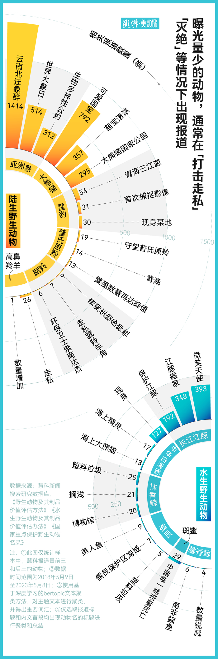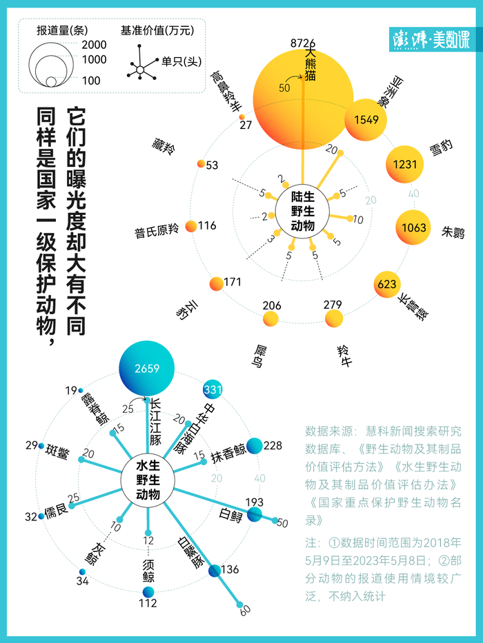 大熊猫作为国宝,相关报道数量超过 8000 余条,高鼻羚羊则只有 27 条。