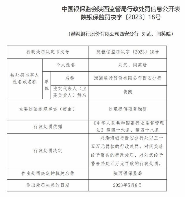 中国银保监会陕西监管局行政处罚信息公开表(陕银保监罚决字〔2023〕18号)显示,渤海银行西安分行因违规提供项目融资,依据《中华人民共和国银行业监督管理法》第四十六条、第四十八条,陕西银保监局对渤海银行西安分行处以35万元罚款的行政处罚;对闫笑晗给予警告的行政处罚,对刘武给予警告并处五万元罚款的行政处罚。