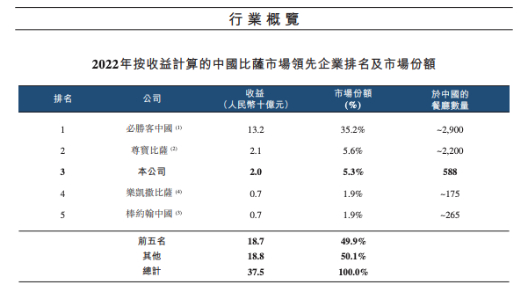 达美乐中国招股书的行业概览显示,在几乎与必胜客相当的门店规模下,尊宝比萨的年收益仅为必胜客的零头21亿,而第三名的达美乐尽管门店数量仅588家,但其收益和尊宝比萨相差无几,也达到了20个亿。