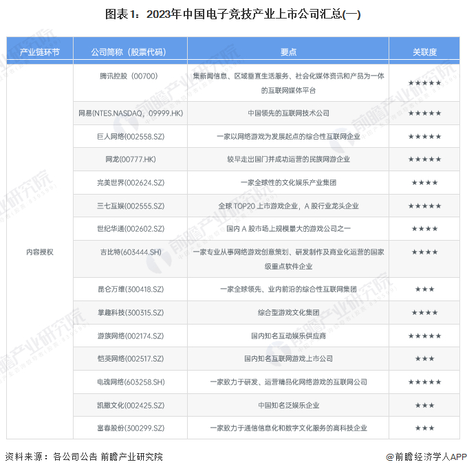电子竞技行业产业链包括电竞内容授权、赛事执行、内容承办、内容传播等。其中,上市公司主要集中在电竞内容授权领域,赛事执行和内容承办基本没有上市企业。具体的电子竞技行业上市公司汇总如下:
