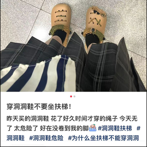 在知道穿洞洞鞋容易卷入扶梯之后之后,很多网友晒出了自己穿洞洞鞋坐扶梯的方式——