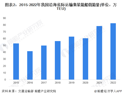 2022年,沿海省际运输集装箱船载箱量83.0万TEU,较2021年底增加4.2万TEU,载箱量增幅5.4%。2022年新增运力47艘、8.1万TEU。