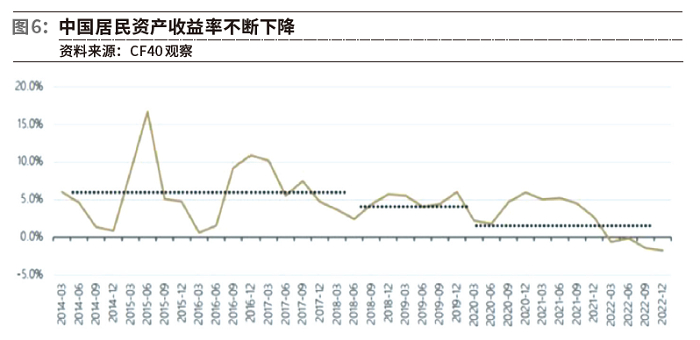 CF40报告还指出,2014年以来,中国居民部门的资产收益率中枢在不断下降,且在2022年一季度首次转负。具体来看,居民部门的资产收益率变化可以分为三个阶段。第一阶段是2014-2017年,这个阶段波动率最大,平均收益率为6.2%。第二个阶段是2018-2019年,这个阶段波动率有所下降,平均收益率为4.5%,较上个阶段下降了1.7个百分点。第三个阶段是2020年至今,平均收益率为2.3%,较上一阶段下降了2.2个百分点。尤其是2021年三季度之后,居民部门资产收益率出现快速回落且首次变为负值,2022年四季度资产收益率为-1.8%。