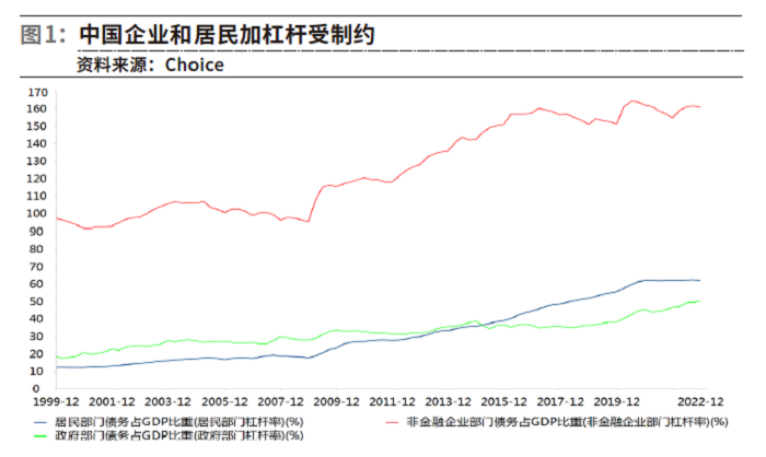 在现代信用经济的背景下,经济的持续上升与经济各部门(居民、企业、政府)的加杠杆行为如影随形,尤其是居民和非金融企业部门的加杠杆推动了过去十多年经济的持续较好增长。但在过去几年,由于疫情的冲击,居民和企业部门的资产负债表状况受到冲击,导致其加杠杆能力和意愿受到抑制,经济增长动力也就显得不足了。