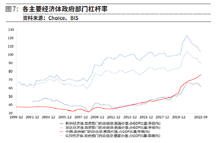 有观点认为,过去三年政府部门在不断的加杠杆,是不是没有多少空间了?确实,在三年疫情的时间里,政府部门的杠杆率从2018年四季度的36.95%快速上升到2022年四季度的50.4%,但这并不意味着政府部门没有了加杠杆空间。