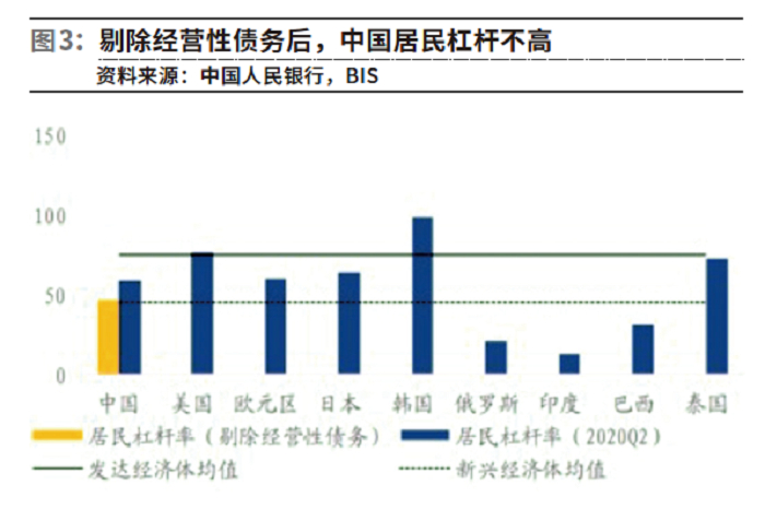 中国的居民加杠杆主要源自房贷、消费贷、信用卡透支增长,但有一部分实际上是个体工商户经营性贷款。在《2020年第四季度中国货币政策执行报告》中,央行指出,中国大约有 20%的居民债务与经营性活动相关,剔除后中国居民杠杆率在国际上处于合理水平。中国居民部门的经营性债务,主要来自个体工商户的经营性贷款,也有一些个体户使用消费贷、信用卡资金经营周转。2020 年上半年末, BIS口径的中国居民杠杆率为59.1%,已接近欧元区和日本;但剔除经营性居民债务后,同期居民杠杆率降至46%左右,在国际上仍处合理水平。