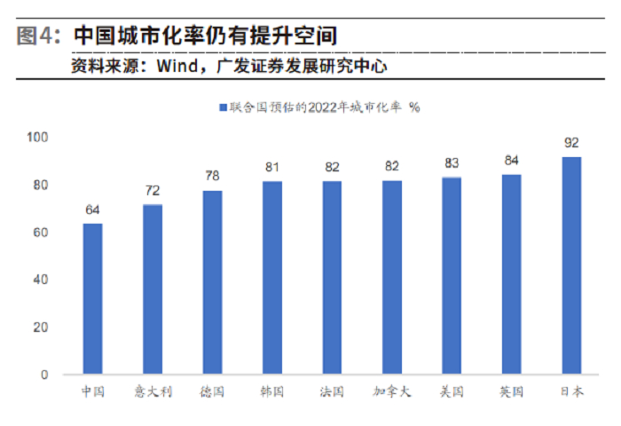 由于中国居民加杠杆的主要对象是住房,而城市化率是影响长期住房需求的一个重要因素。按照联合国口径,中国在2022年城市化率为64%,低于美国的83%、日本的92%、 韩国的81%。广发证券判断,中国的城市化率低于大部分发达经济体,仍有进一步提升空间,利于居民部门加杠杆。