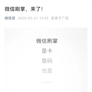 5月21日,微信派发布消息称,微信刷掌支付已经正式发布,用户目前可以在刷脸设备上进行刷掌操作。需要现在设备绑定个人微信账号,录入手掌纹样。消费时,将手掌对准支付设备的扫描区,确认后即可完成支付。