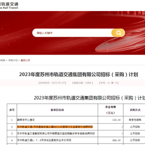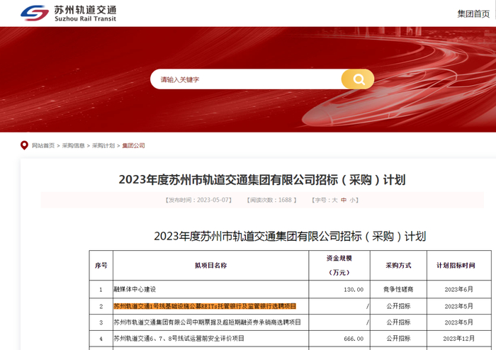 2023年5月7日,2023年度苏州市轨道交通集团有限公司招标(采购)计划,包含苏州轨道交通1号线基础设施公募REITs托管银行及监管银行选聘项目,采购方式公开招标,计划招标时间为2023年5月。