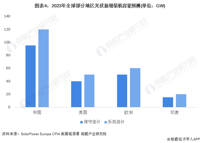 据SolarPower Europe预测,2023年欧洲新增光伏保守估计50GW,乐观估计60GW以上;中国光伏行业协会保守估计2023年中国新增光伏装机为95GW,乐观估计超过125GW;美国能源署表示,2023年美国将新增公用事业规模光伏装机29.4GW,加上屋顶分布式总新增或将超过50GW。