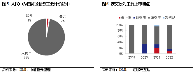 从计价货币看,2019年以来发行的自贸区债券以人民币为主要计价货币,占比约97%,2023年新增债券均为人民币离岸债券。从上市地点看,澳交所为主要场所,占比月74%。2023年以澳交所为主,占比83%;新交所近年有所上升,2022年和2023年分别有7只和6只,此外,有4只债券在澳交所和新交所同步上市。
