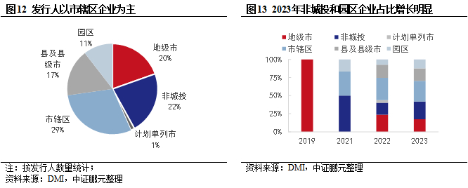 从发行人行政级别看,市辖区企业占比42家,占比29%;地级市企业28家,占比20%;县及县级市企业24家,占比17%,园区企业15家,占比11%。与2022年相比,2023年非城投和园区企业占比提升明显,分别增长至25%和12%。