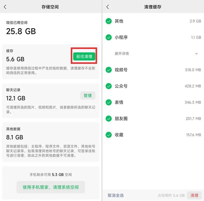 微信里除了一些重要数据占用空间外,还有一大部分是聊天时的缓存数据,清理后不会影响微信的正常使用。