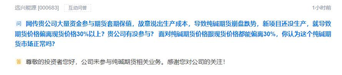 5月22日,有投资者在互动易平台向远兴能源提问“网传公司大量资金参与期货套期保值,故意说出生产成本,导致纯碱期货崩盘跌势,新项目还没生产,就导致期货价格偏离现货价格30%以上?公司有没参与?”对此,远兴能源在互动易回复称,公司未参与纯碱期货相关业务。