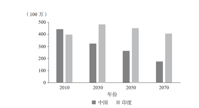 当印度在 2040 年达到中等收入国家水平时,印度将拥有世界上最大的人口数量,具有最大的规模优势(见下图)。而英语作为官方语言也是印度的优势,英语更好的印度人才更容易进入世界市场,印度企业更容易在世界各地经营,印度学术界会更轻松地与世界其他地区交流。此外,常用英语的优势使得印度能够吸引更多的移民。