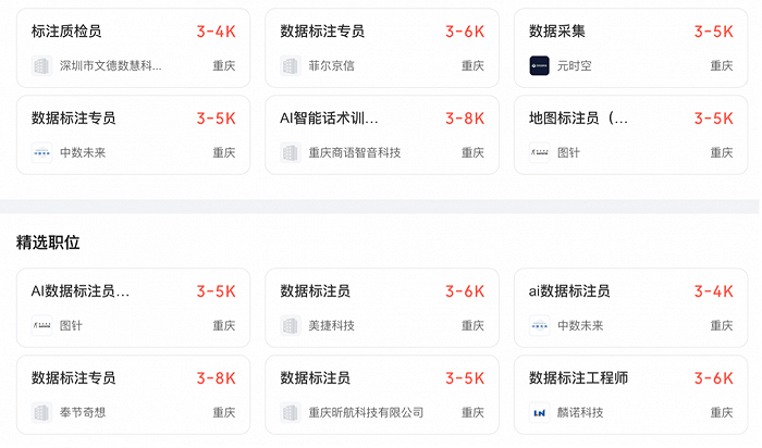 而在BOSS直聘等招聘网站上,数字标注员的公司月工资大都在3K-5K,岗位要求在大专及以上学历,专业不限。在贵州、西安等地的县城里,数据标注员的工资仅仅过千。