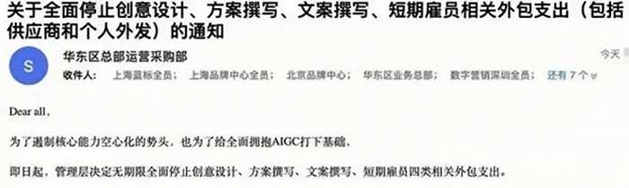 知名公关及广告服务商蓝色光标打响了用AI优化人员配置的第一枪。4月12日,蓝色光标内部邮件截图被爆出,为了“给全面拥抱AIGC打下基础”,蓝色光标决定无限期全面停止创意设计、方案撰写、文案撰写、短期雇员四类相关外包支出。对此,蓝色光标方回应媒体称,相关邮件内容属实。