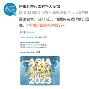 5月22日一早,阿根廷共和国驻华大使馆官宣了一条重磅消息:6月15日,梅西将带领阿根廷国家队在北京与澳大利亚进行一场友谊赛。