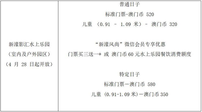 新濠影汇水上乐园门票现已开售。只需于新濠风尚微信小程序免费申请成为“新濠风尚”微信会员,可享受最新优惠,目前室内外区域已全面对公众开放,游客可尽情享受水上乐趣。