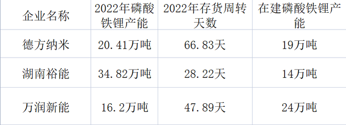 从财务信息来看,德方纳米的存货周转天数明显长于同行企业。湖南裕能、万润新能2022年年报披露,两家公司的存货周转天数分别为22.82天、47.89天,而德方纳米为66.83天。