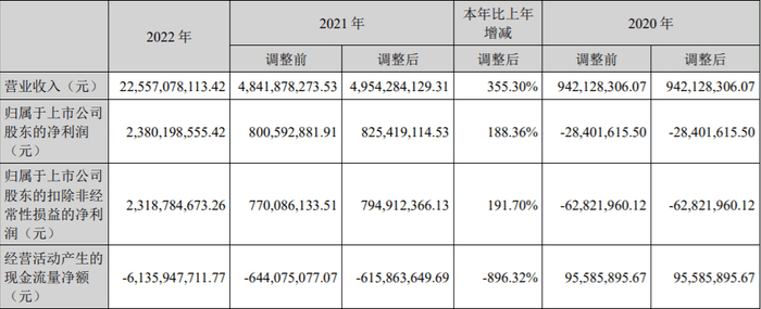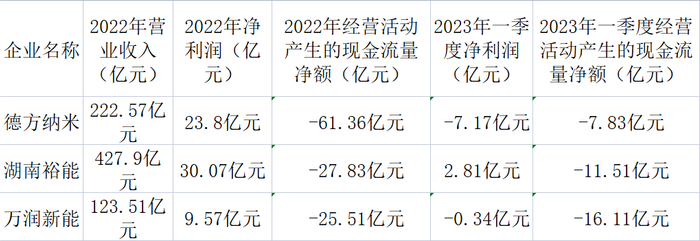 譬如与湖南裕能对标。湖南裕能2021年、2022年年报显示,经营活动产生的现金流量净额分别为-5.43亿元和-27.83 亿元。据查询,湖南裕能2021年和2022年营收分别为70.68亿元和427.9亿元,同期德方纳米的营收分别为49.54亿元和225.6亿元。