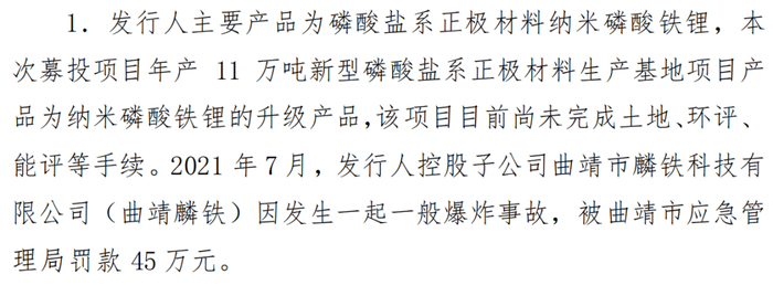 此外,问询函要求公司补充披露最近36个月是否存在受到环保领域行政处罚的情况,是否构成重大违法行为,或是否存在导致严重环境污染,严重损害社会公共利益的违法行为。据查询,2021年7月,德方纳米控股子公司曲靖麟铁因发生一起一般爆炸事故,被曲靖市应急管理局罚款45万元。