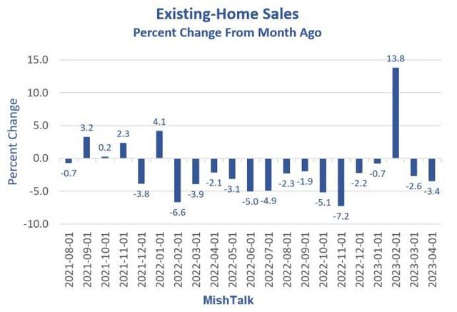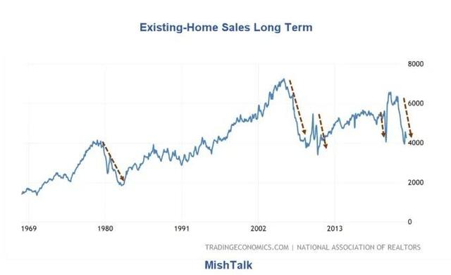 Shedlock提到了上周华尔街见闻文章指出过的最新数据趋势:过去15个月内,美国成屋、即二手房销售有14个月都的销售户数都环比下降。他认为,目前的利率已经足以削弱楼市。