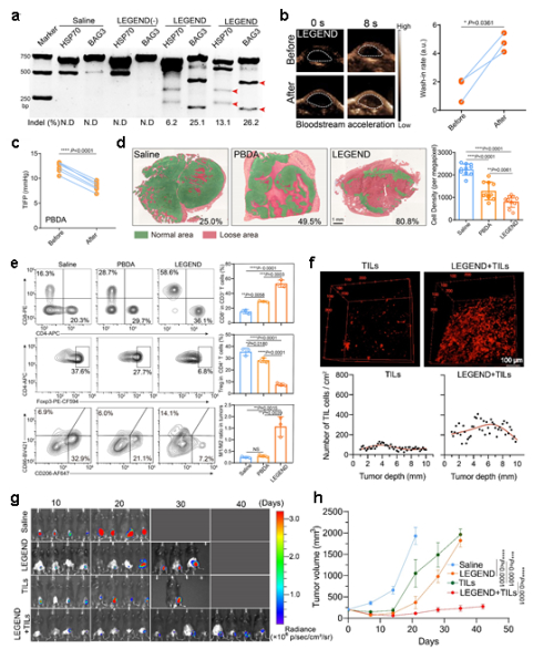 图2.LEGEND体系多维度协同改善细胞内凋亡抗性和细胞外微环境,提升TIL疗法治疗效果。a.LEGEND+NIR照射激活瘤内基因编辑,敲除肿瘤细胞抗凋亡基因(HSP70和BAG3);b-d.NIR温热效应打破实体瘤的物理屏障,包括血流加速(b)、间质压力降低(c)、组织疏松(d);e.NIR温热效应改善肿瘤免疫抑制微环境;f.LEGEND处理后显著增强TIL的瘤内浸润;g-h.LEGEND处理后显著提升TIL回输疗法的抑瘤效果。