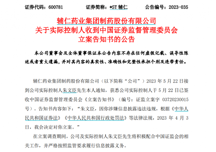 *ST辅仁22日发布的公告显示,公司于5月22日接到公司实控人朱文臣本人通知,获悉其于5月22日已签收证监会《立案告知书》。该文件指出朱文臣涉嫌信息披露违法违规,已于4月3日被立案。