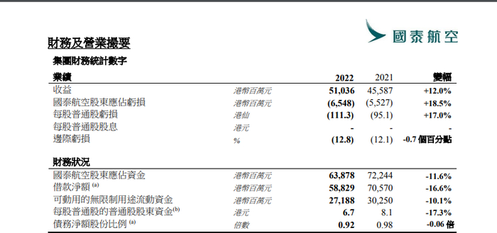 3月8日,国泰航空公布2022年全年业绩,期内集团实现收益510.36亿港元,同比增长12.0%;国泰航空股东应占亏损65.48亿港元,同比扩大18.5%。