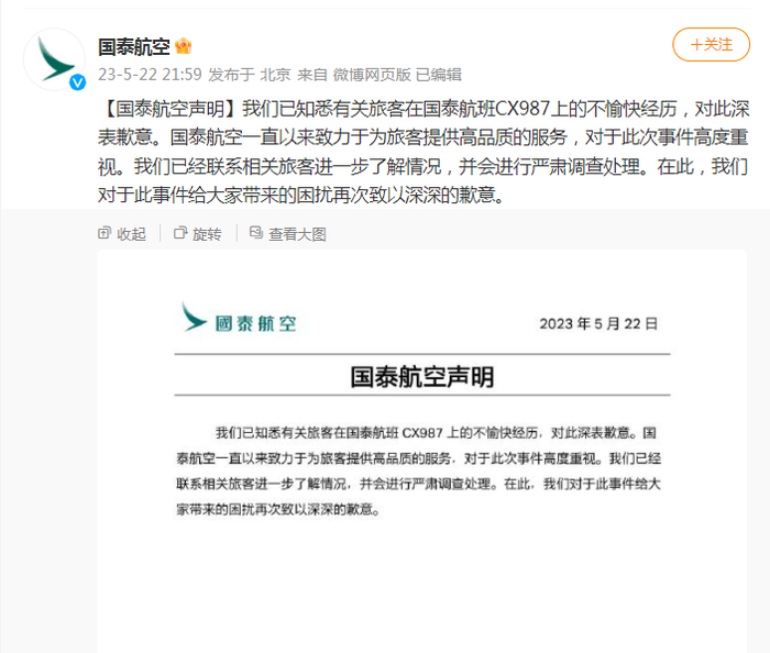 5月22日晚,国泰航空官方微博发布声明:已知悉有关旅客在国泰航班CX987上的不愉快经历,对此深表歉意。国泰航空一直以来致力于为旅客提供高品质的服务,对于此次事件高度重视。我们已经联系相关旅客进一步了解情况,并会进行严肃调查处理。在此,我们对于此事件给大家带来的困扰再次致以深深的歉意。