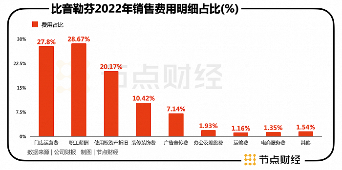根据公司招股书及近期年报,在比音勒芬的销售费用中,“职工薪酬、门店运营费、使用权资产折旧、装修装饰费”四项的占比最高,合计占比接近九成。