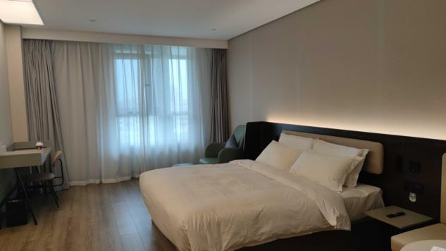 打开酒店房门后,潘哥发现房间面积大了许多,屋内大床、沙发、书桌、圆桌、置物架、椅子、智能电视等一应俱全,每一件都是现代、新潮的款式。