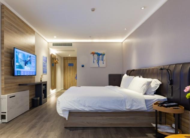 汉庭的3.0版本,潘哥称之为“欧式奢华风”,酒店房间采用了金可儿床垫、LoveFu床品,大堂采用了意大利B&B家具;还进行了智能化升级,增加了语音控制系统、无线充电设备等。