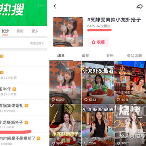 这个周末,你被#贾静雯最爱的长沙小龙虾新搭子#微博上的热门话题所吸引了嘛?截至发稿前,话题阅读量1.1亿次,讨论次数2.2万;不仅微博,还在抖音平台上登上热门,截至5月23日上午10点,#贾静雯同款小龙虾搭子#话题播放量已破6475.9万次。