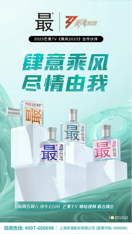 从这个角度出发,《乘风2023》作为一档高人气的女性励志成长音乐节目,集结了专业歌手、演员、舞蹈艺术家等不同行业的实力女性,通过多场竞演展现国际化的音乐风格和舞台魅力,“时尚、潮流、独立精神、追求自由与自我”成为节目传递出的调性。而合作伙伴上海贵酒·最®酒定位潮生活新白酒,主打年轻时尚的“炫彩生活,尽情由我”文化,无论是产品颜值,还是品牌调性都与节目非常契合。