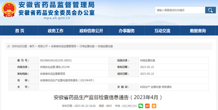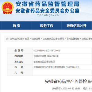 中国质量新闻网讯 近日,安徽省药品监督管理局发布药品生产监督检查信息通告(2023年4月)。具体信息如下: