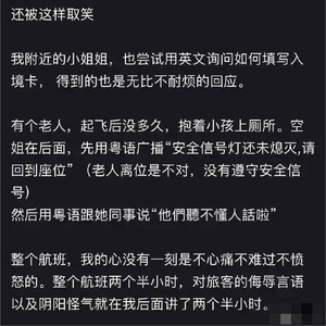 即使乘客不会说英语,乘务员也可以通过其他方式,如姿势、手势等肢体语言方式进行良好的沟通和协助。视频和音频显示,空乘人员显然是能够清楚地了解到乘客的需求的,但她们完全没有尽职尽责地完成自己的分内事,反而聚集嘲讽。到现在还有人因会说两句外国话而嘲笑人,真是滑天下之大稽,这次网友的反映就是告诉他们,最该被嘲笑的恰恰是他们。