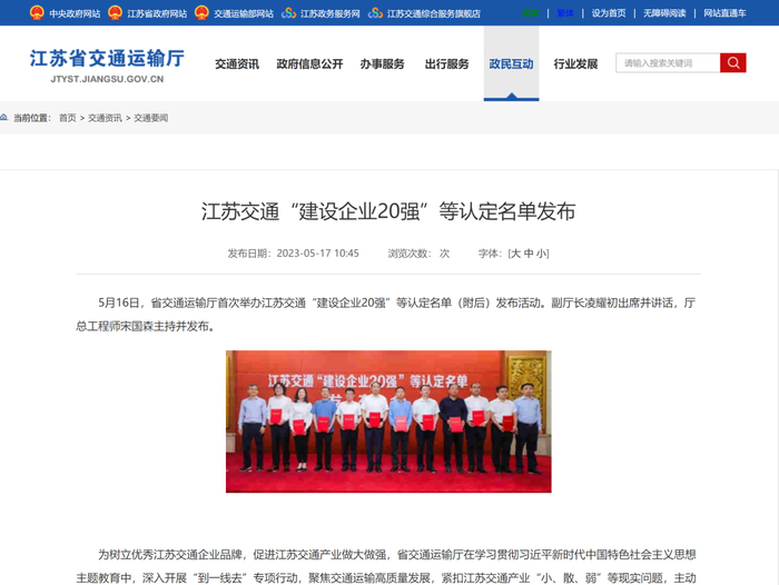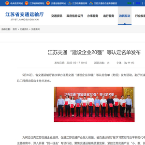 近日,江苏省交通运输厅发布全省交通建设企业20强、交通运输企业25强、港口企业20强、数字交通企业10强等认定名单,着力培育骨干龙头企业,推动交通产业发展。