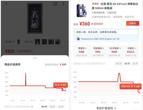 而批价受压制,也进一步影响了商品终端的销售。据网络数据显示,青花20、青花30复兴版的售价均创下了近半年的新低。